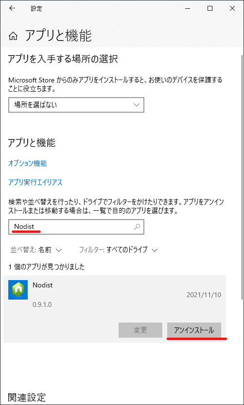 別のツールに乗り換えるため、Nodistをアンインストールします。