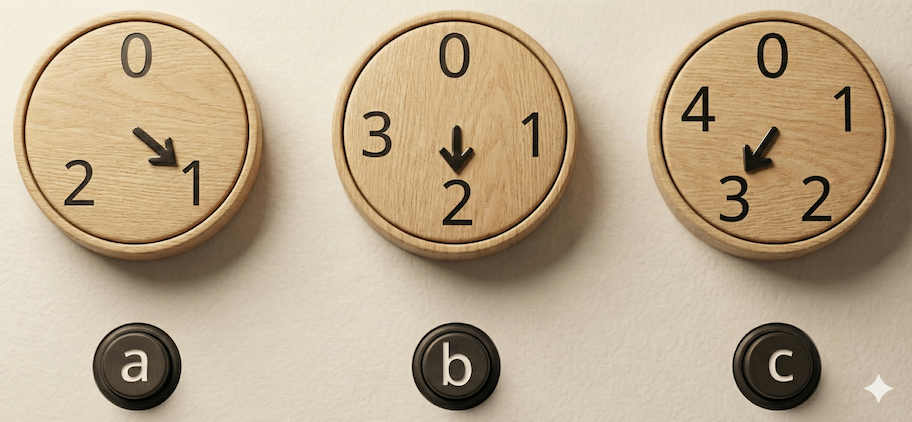 - 押しボタン a を押すと、左の時計の針が2時間進み、中央の時計の針が1時間進む