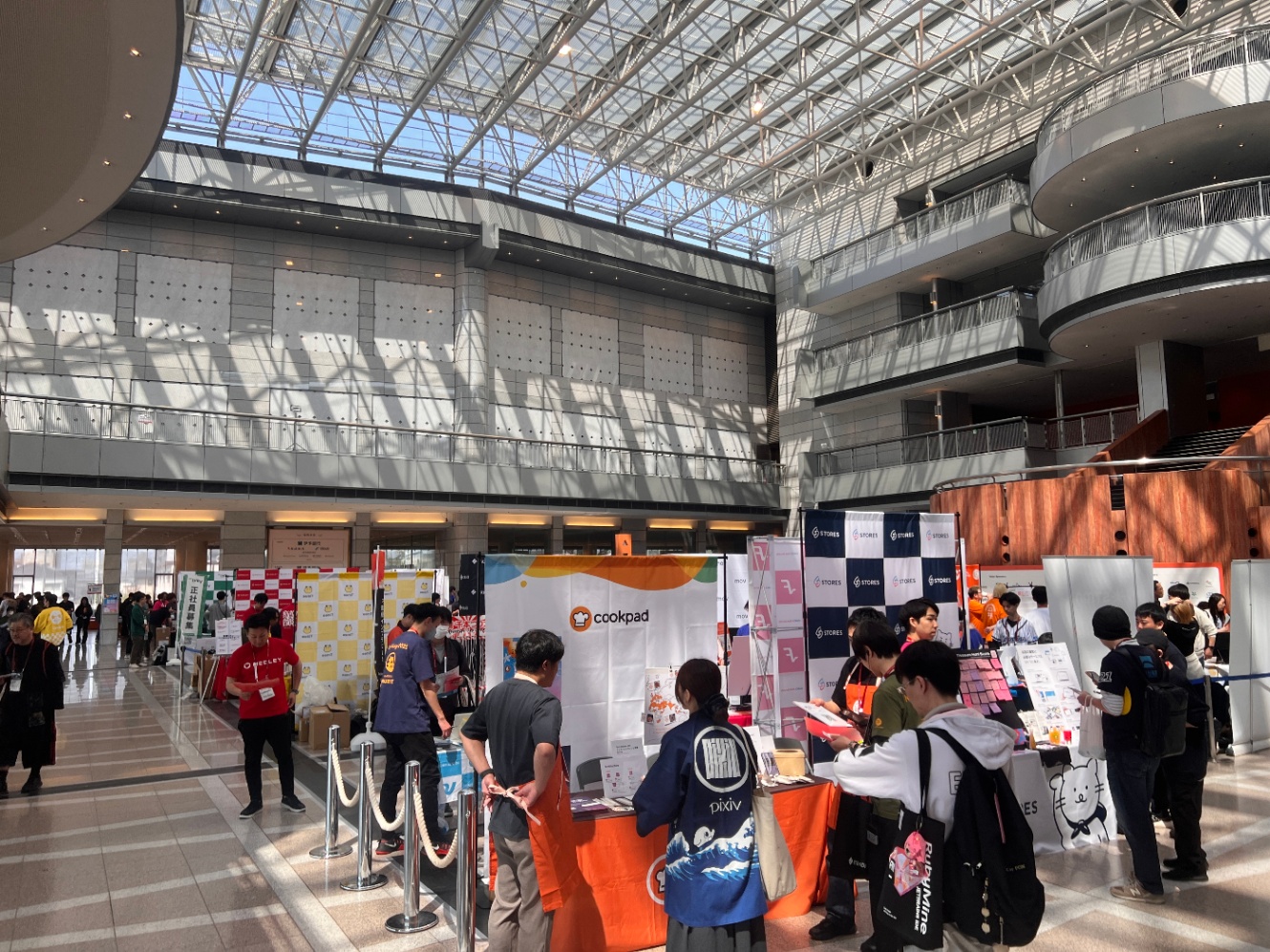 会場の中に入ると、広々としたブースエリアが広がっていて、多くの企業やコミュニティが展示をしていました。
