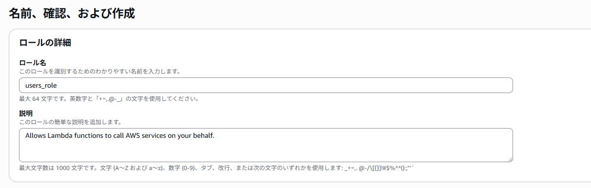 Set the function name and set the runtime to "Python". For the execution role, select "Use an existing role", choose the "users_role" you created earlier, and click "Create function".