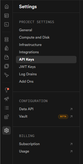 <your_supabase_api_key>on the Settings -> API Keys page.- There are two types of API keys, but we will use the default "Publishable key" for this tutorial.