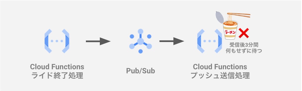 先ほどの要求を実現するのに、まずパッと浮かんだのは「ライド終了をトリガーにPub/Subトピックを飛ばし、それをサブスクライブするFunctionで一定時間waitしてからプッシュ送信」でした。