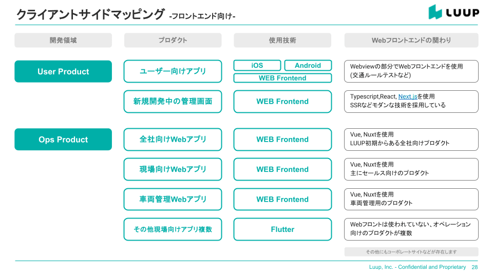 | オペレーションプロダクト | LUUPのサービスを裏側で支える、社内スタッフ向けのプロダクト群です。 | Web管理画面・現場向けWebアプリ |