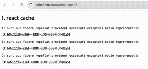 cache はデータ取得や計算の結果をキャッシュしてくれる関数で、サーバーコンポーネントでのみ使えます。そのcache を使って同じデータ取得をメモ化してみましょう。