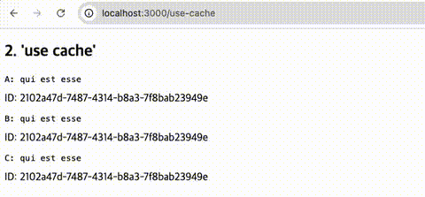 また、'use cache' はリクエストを跨いでキャッシュすることができます。'use cache' のキャッシュのデフォルト寿命は15分なので、その間は何回リロードしてもずっとキャッシュが使われます。(キャッシュ寿命は cacheLife で調整できる)
