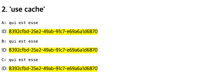 本当にキャッシュできるかどうかを目で確認するためにデータ取得が実行されるたびにユニークなIDを生成するようにしました。(キャッシュされた場合 ID が変わらないはず)