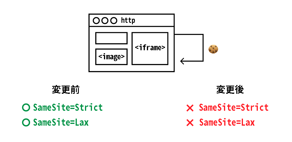 今まではhttpサイトとhttpsサイトの間にサブリソースロードでCookieを送信できました。変更後はhttpサイトとhttpsサイトはcross-site扱いになり、Cookie設定をSameSite=StrictまたはSameSite=Laxにしたら送信できなくなります。