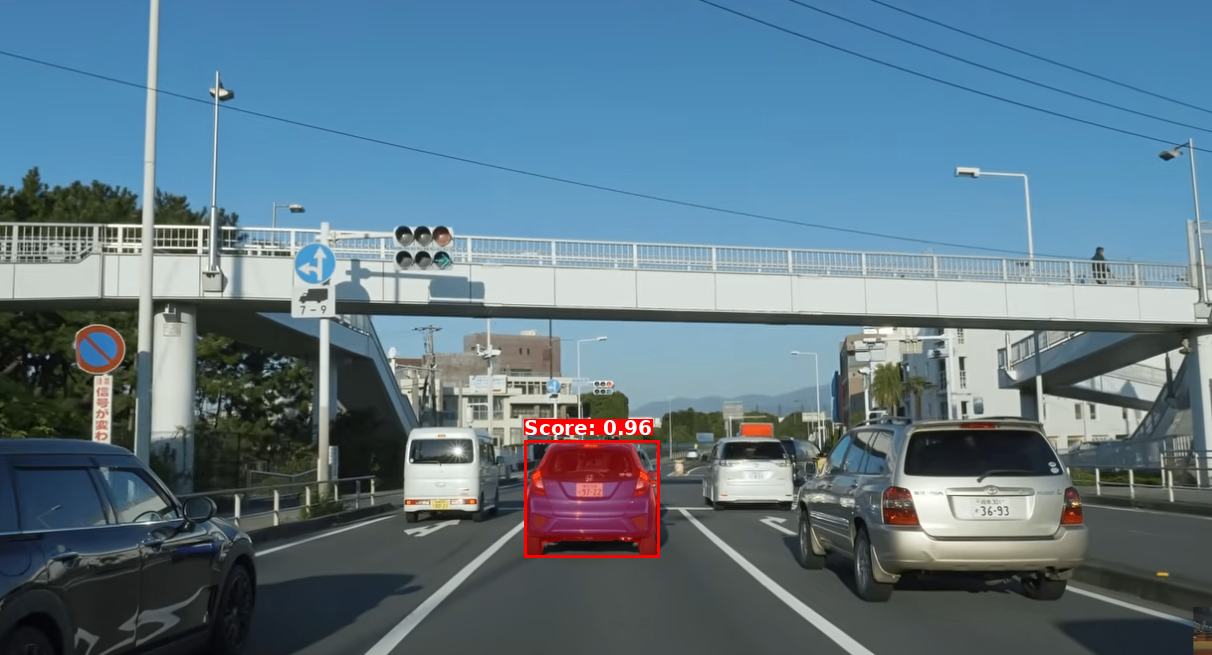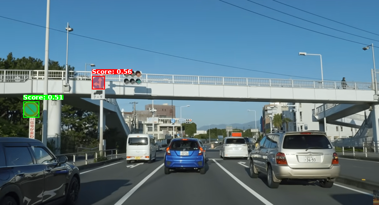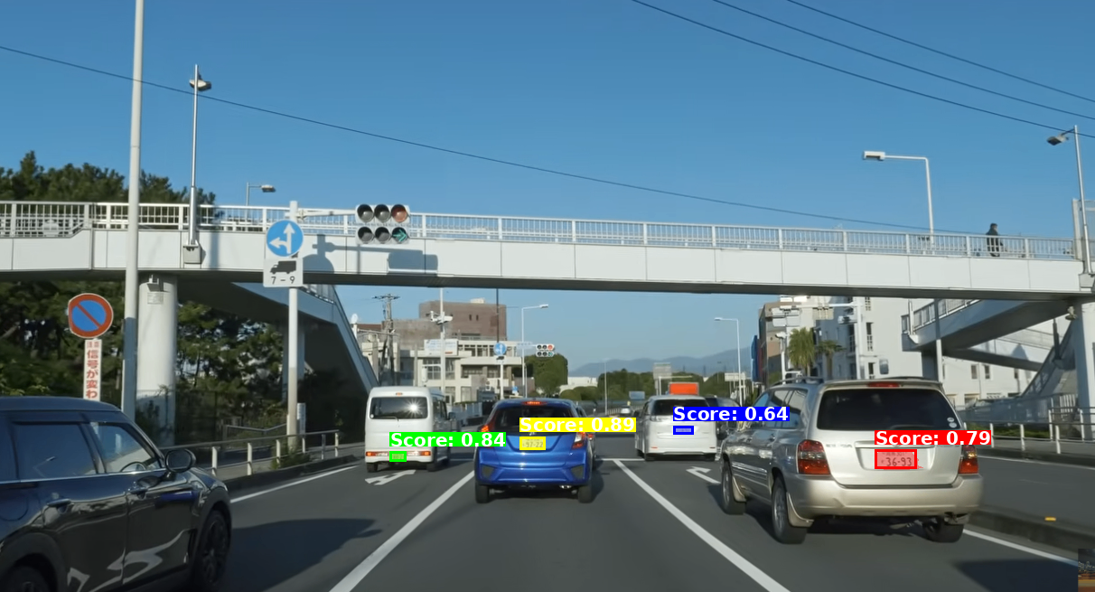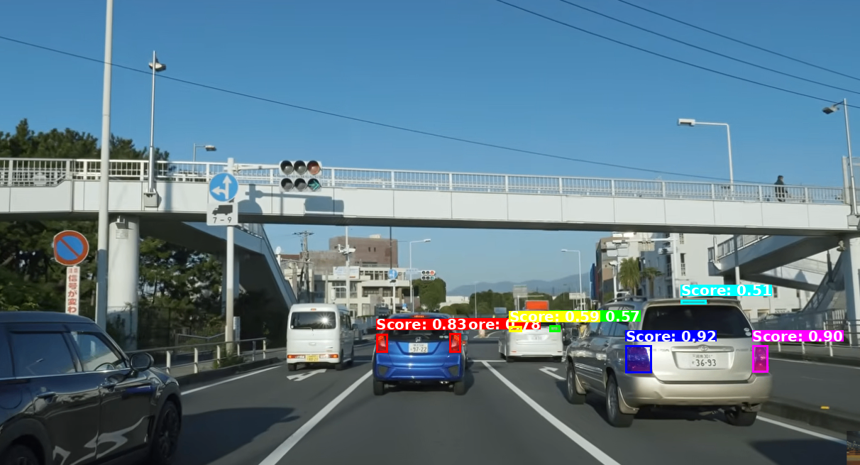 青い車の左の軽のミニバンのテールライトは取得できていないですが、ほかの車のテールライトは取得できてますね。結構スコアも高い。
