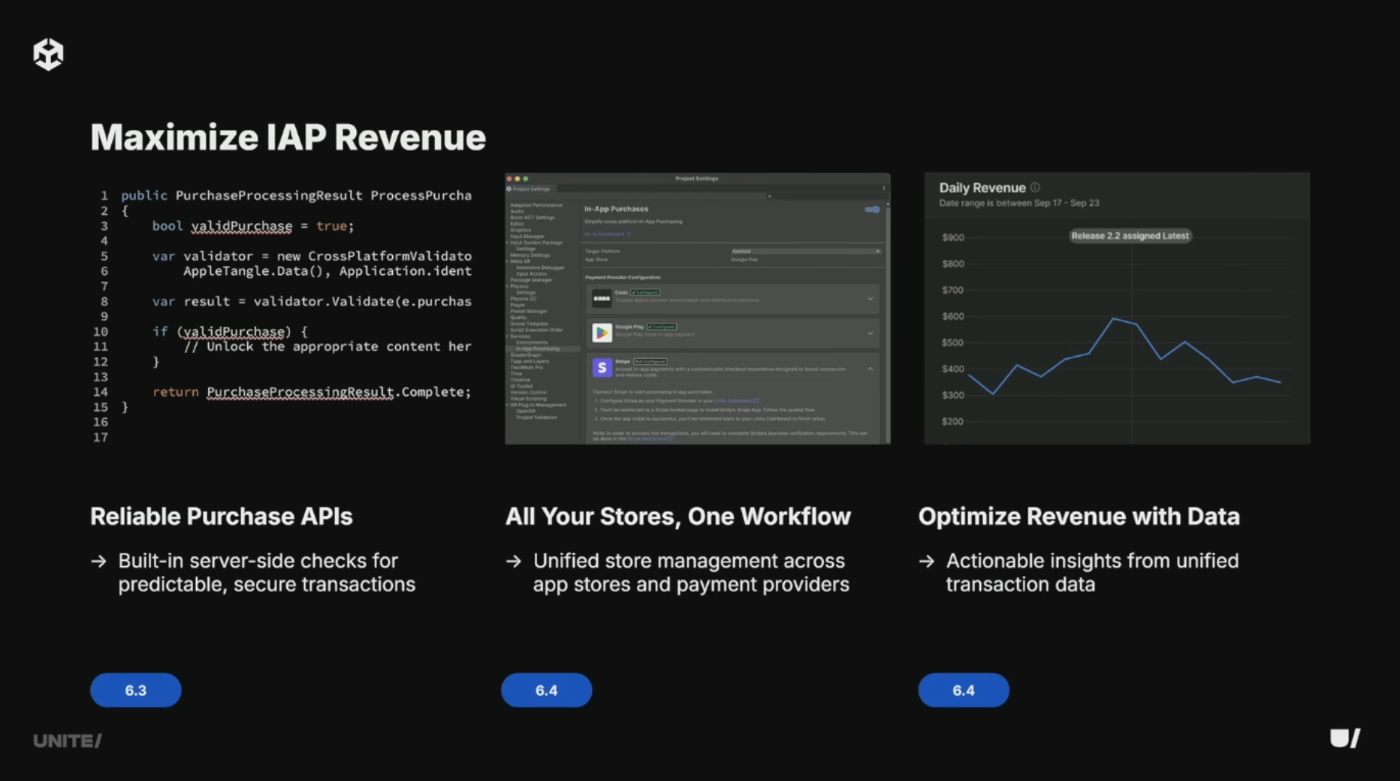 全販売チャネルのデータを一元化し、標準スキーマで提供。IAP5は新アーキテクチャで安定性と柔軟性を向上。サーバーサイドトランザクション検証と領収書検証を追加予定。WebとPCにも拡張し、全プラットフォームで統一モネタイゼーション体験を提供。