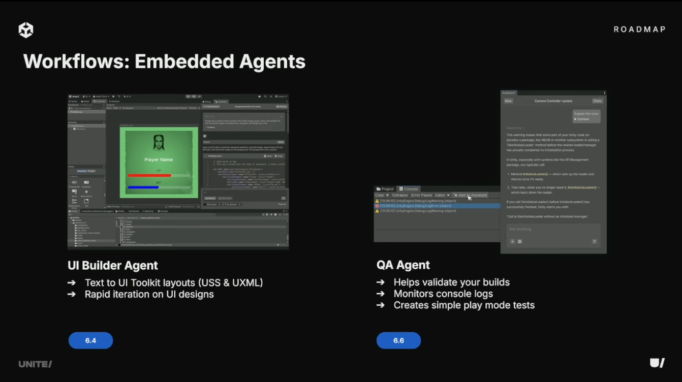 エディタワークフローにエキスパートエージェントを統合。新しいUI Builder AgentはテキストからUI Toolkitレイアウトを生成。新しいQA Agentはコンソールログを監視してエラーの早期発見を支援。