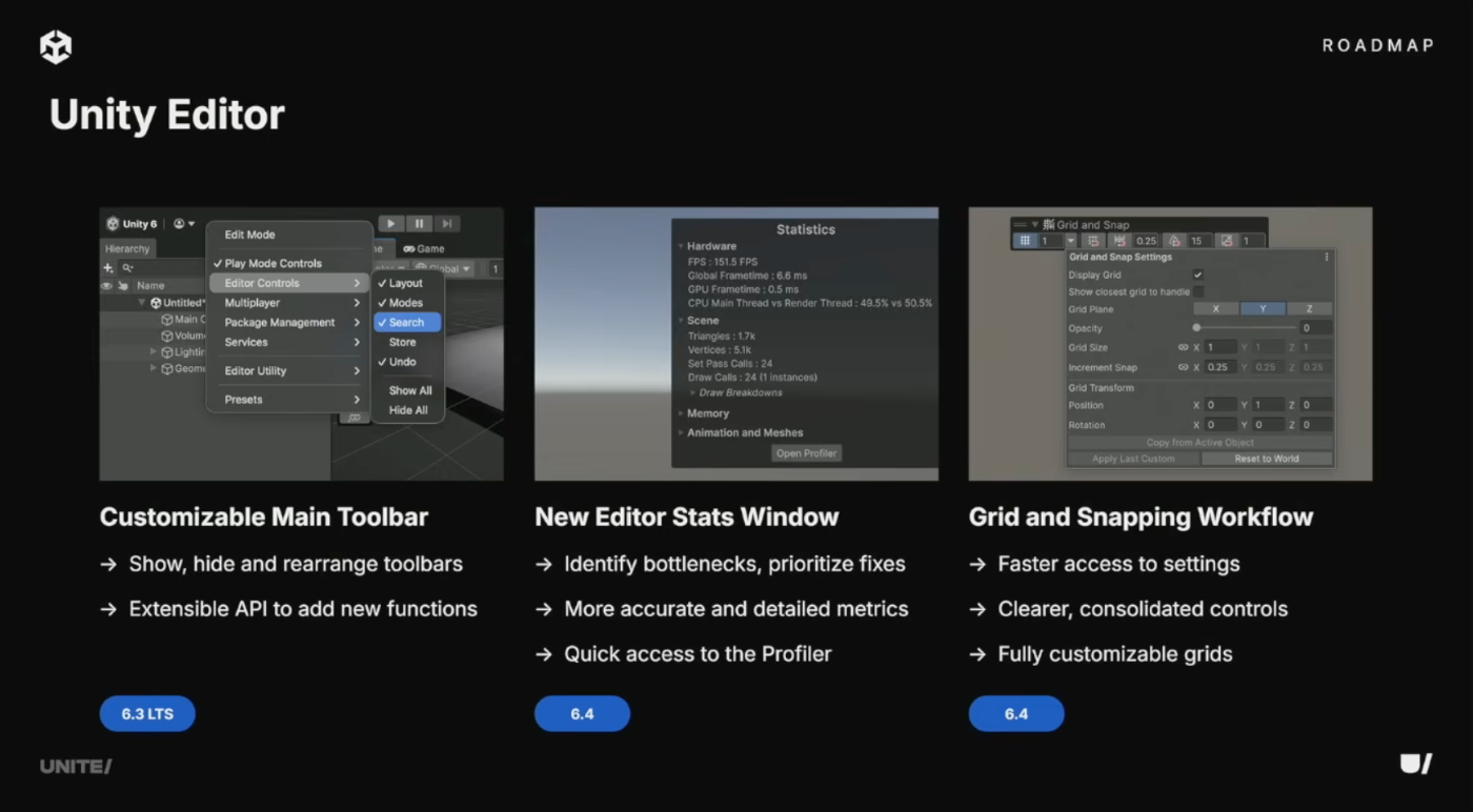 6.3ではメインツールバーのカスタマイズが可能に。6.4では新しいEditor Stats Windowを導入し、プロジェクトのパフォーマンス指標を監視可能に。グリッドとスナップのコントロールも明確さと使いやすさを重視して再設計。