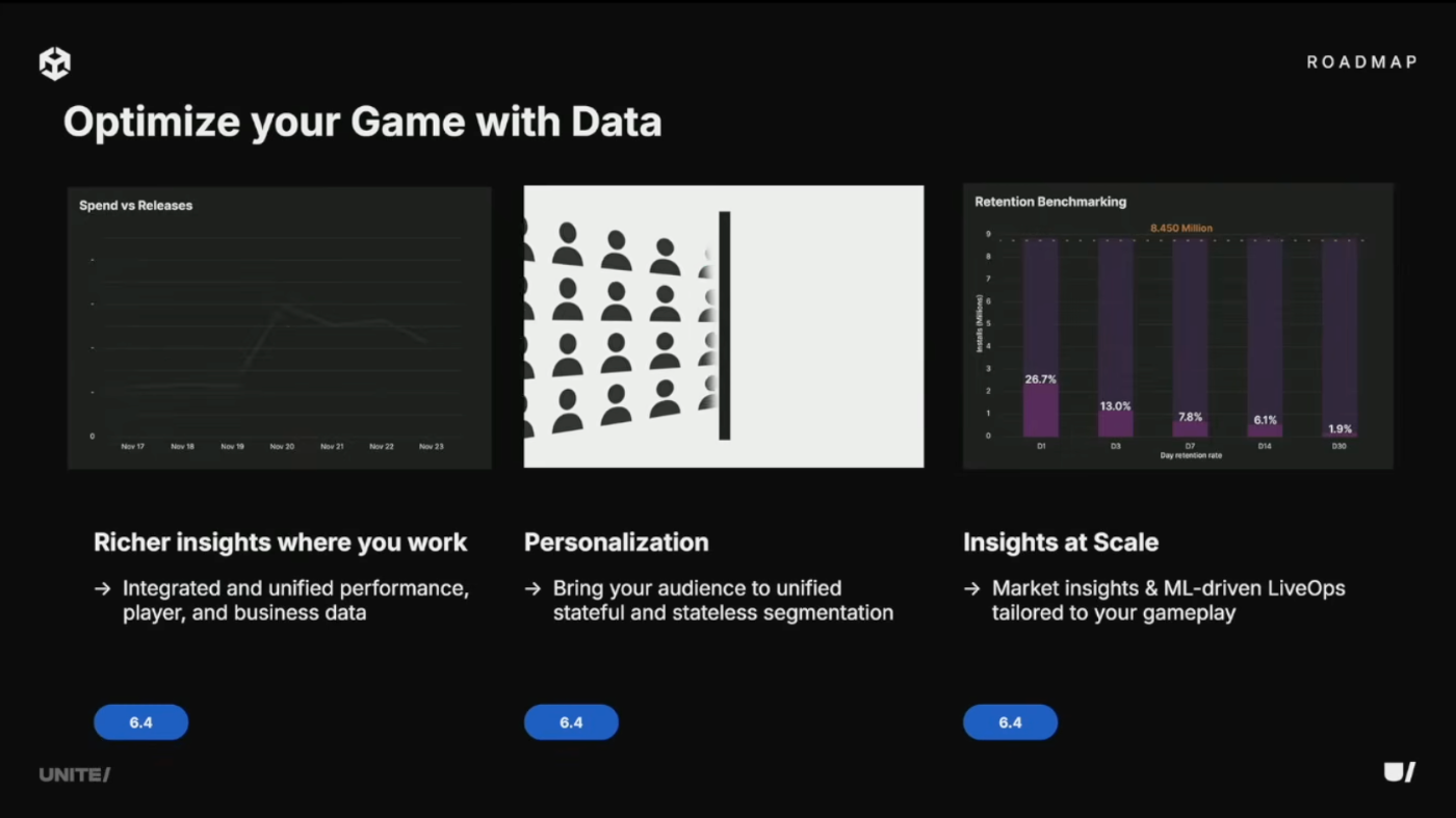 Developer Data Frameworkは2022 LTSと6.0 LTSにも対応予定(これらのバージョンではデータ収集を手動で有効化する必要あり)。6.4からはデータモデルを統一し、データ設定で承認すれば複数ソースからのデータを連携可能に。拡張されたIAP、ランタイムとエンジンの内部シグナル、サードパーティソースなど新しいデータソースを追加。これにより、プレイヤーがゲームを見つけ、遊び続け、課金に至るまでの流れを一貫して把握できるようになる。