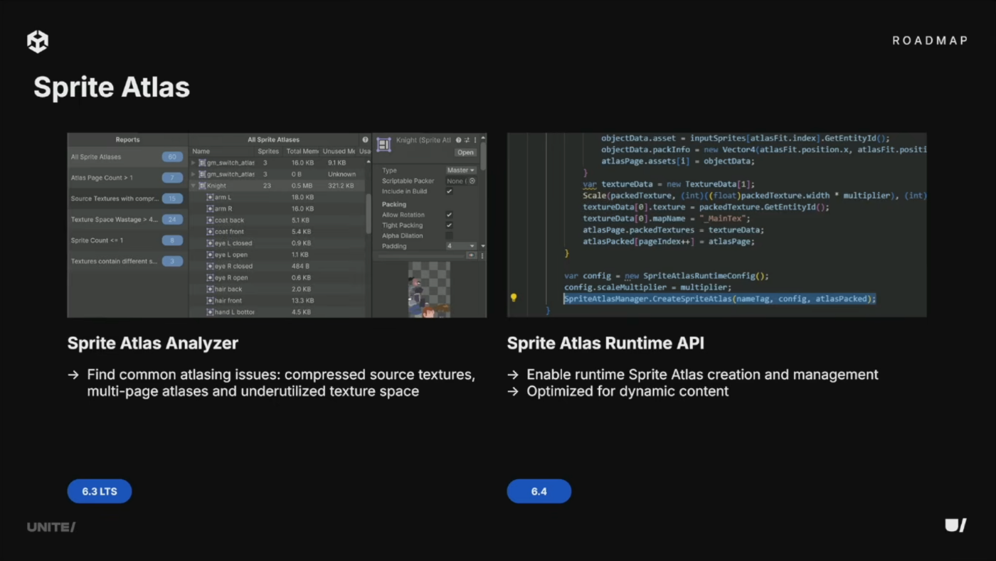 6.3ではSprite Atlas Analyzerツールを追加し、アトラスの効率性をレポート。6.4ではSprite Atlas Runtime APIで動的コンテンツ向けの最適化が可能に。