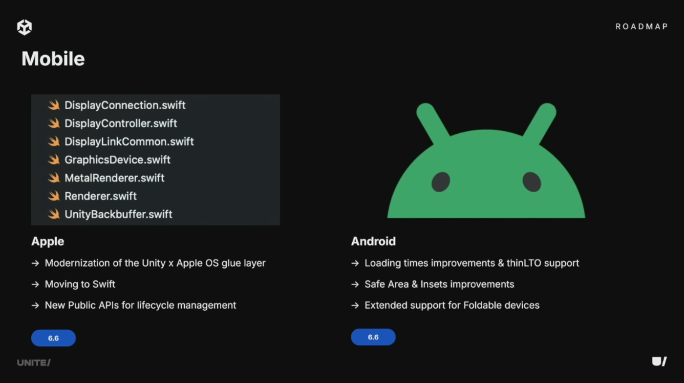 6.5ではThin LTOビルドを導入し、CPUバウンドのパフォーマンスを向上。Android 15における折りたたみ端末やエッジツーエッジスクリーンなど、デバイスの多様化が進む中、Safe AreaアーキテクチャとAPIをアップグレードしてあらゆる画面形状にゲームを適応させる。折りたたみ固有の機能(状態、向き、オクルージョン)向けの直接C APIも追加予定。