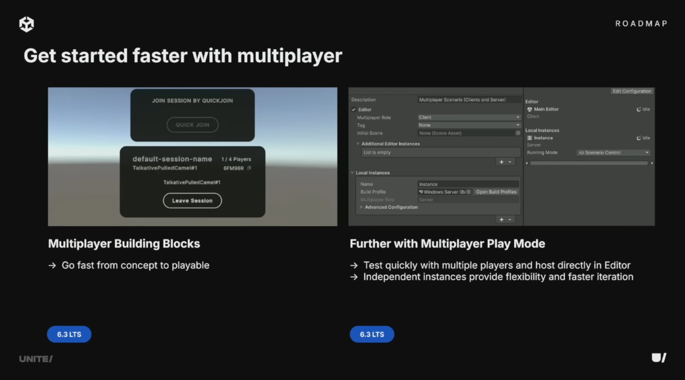 6.3ではロビーとマッチメイキングを内蔵した専用のUnity Building Blocksにより、Unityでのマルチプレイヤー開発がさらに容易に。Multiplayer Play Modeはエディタツールとして進化し、6.3ではシナリオから独立して動作するインスタンスを実行可能に。コアモジュールとしてエンジンに深く統合され、ショートカットやAPIでのアクセスも容易になりワークフローを効率化。