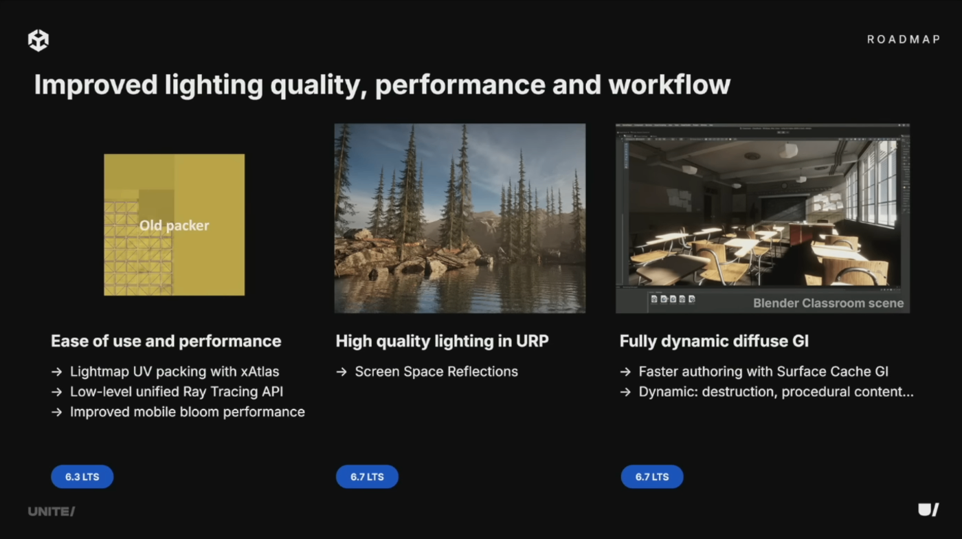 6.3ではXatlasによるUVパッキングでライトマップオーサリングを簡素化。新しい統一レイトレーシングAPIによる低レベル制御も追加。各プラットフォームに合わせたライティング品質の最適化にも注力し、モバイルでのBloomパフォーマンス改善、URPへのScreen Space Reflections追加を実施。URP向け完全動的GI「Surface Cache GI」も開発中で、プロシージャル生成コンテンツやランタイムでの破壊表現など、動的環境における間接光ソリューションとなる。
