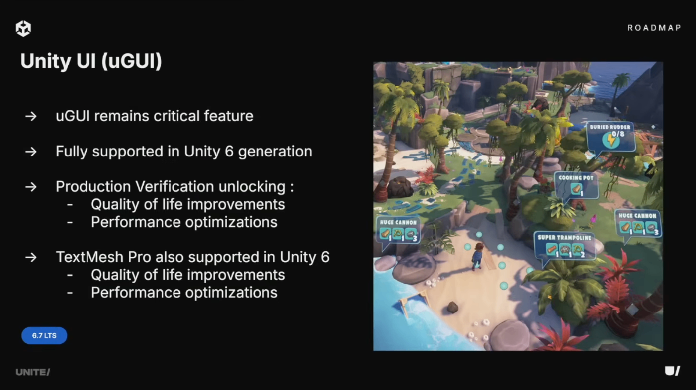 uGUIはUnity 6世代においても継続的に改善予定。Survival Kidsでの実使用を通じてQOL改善、パフォーマンスボトルネックの特定と修正、TextMeshProとAddressablesの統合強化を実施中。