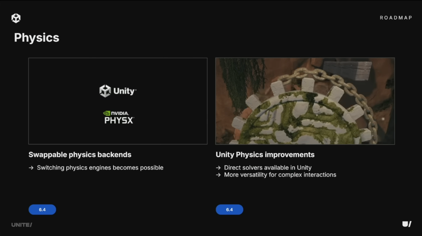 6.4では差し替え可能なPhysicsバックエンドと、Unity Physics Direct Solverを導入予定。より複雑な機械的インタラクション(歯車やレバーなど複雑に連動するギミック)やロープの物理挙動を実現。