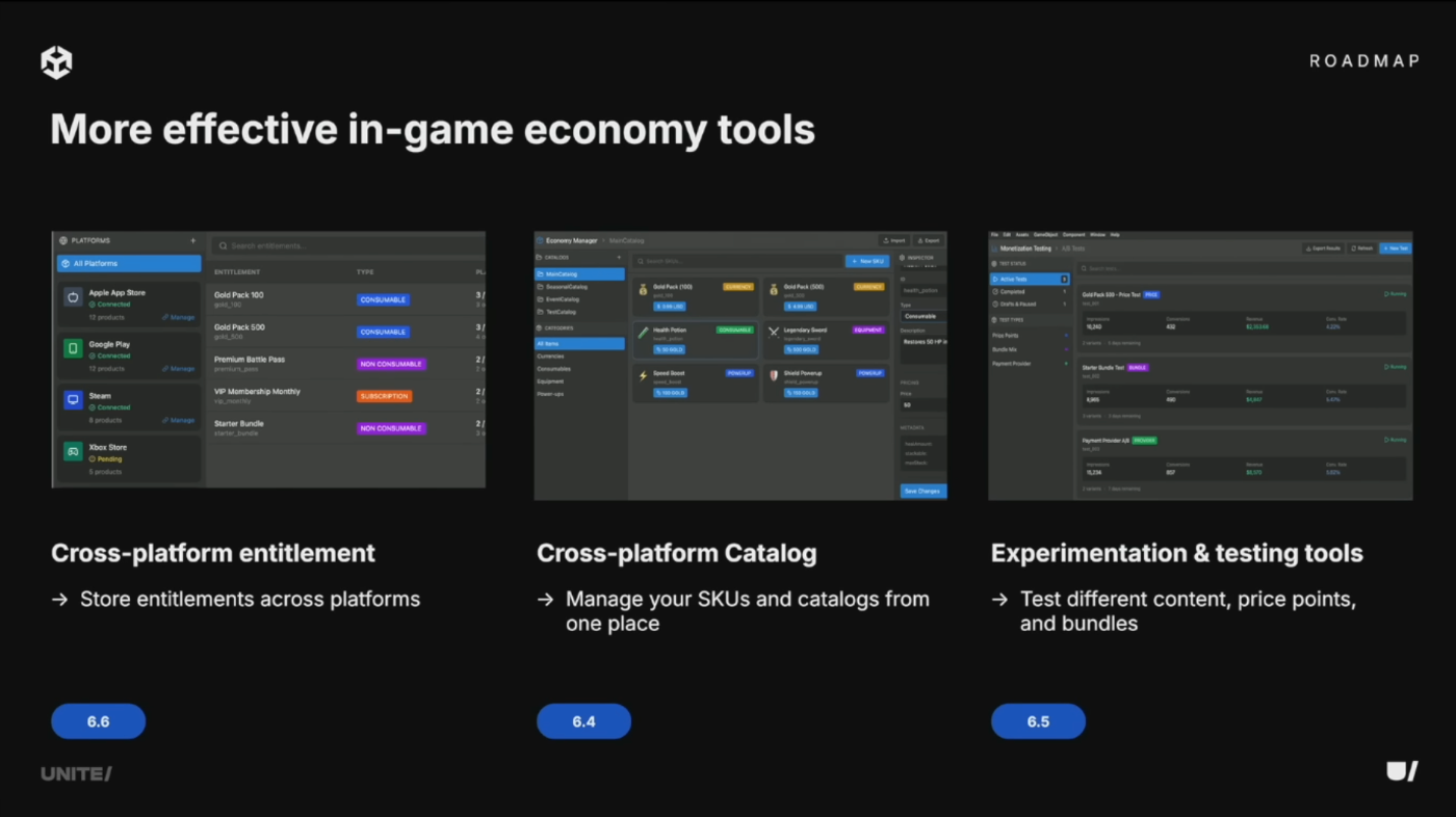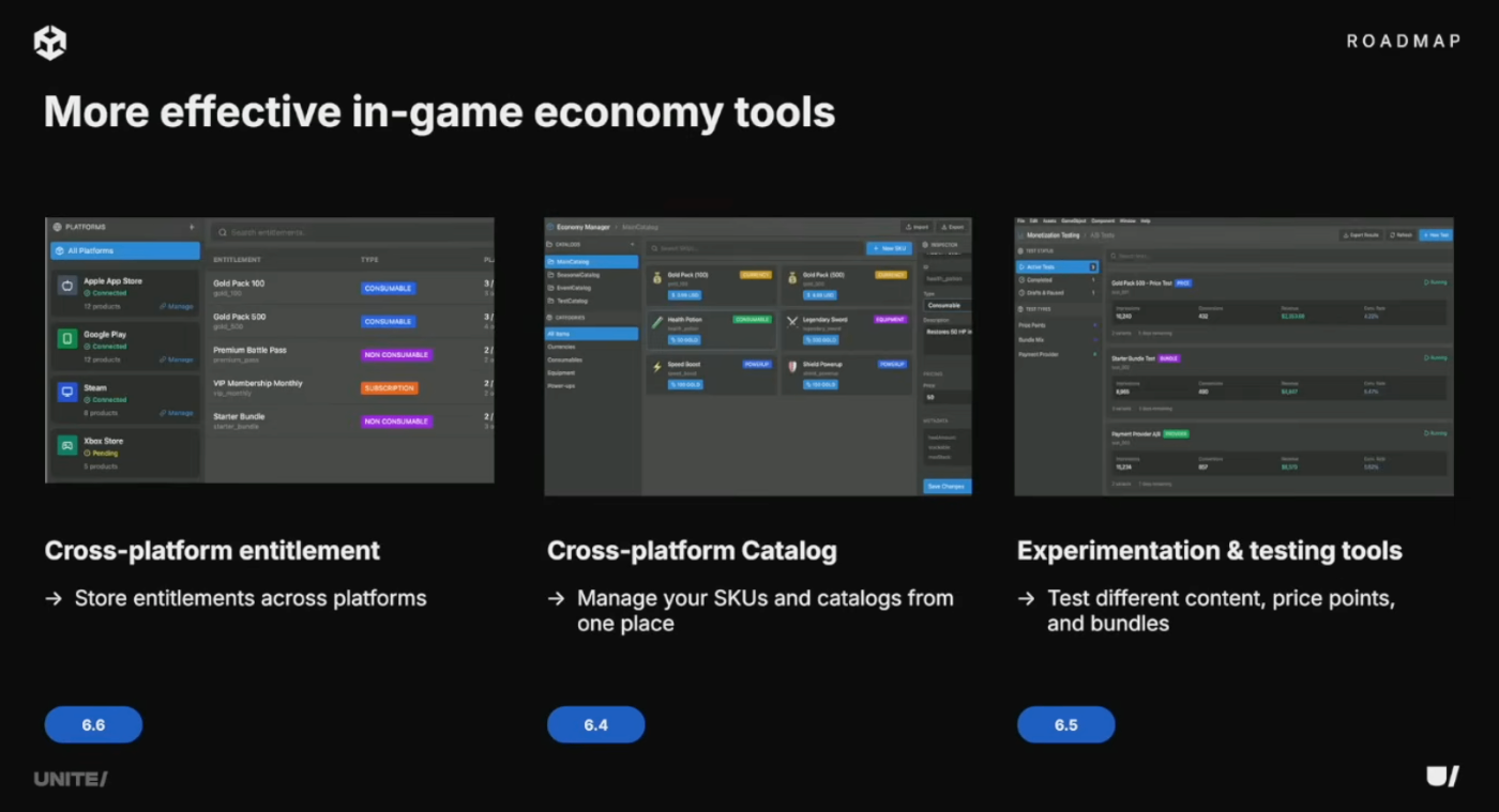 複数ダッシュボード間のSKU管理を一元化。API、Unityダッシュボード、CLI、エディタからアクセス可能な単一の信頼できるソース。全ストアフロントに同期し、実験とセグメンテーションを推進。ファーストパーティデータとDeveloper Data Frameworkデータの結合、ターゲティングリストとしての再利用が可能に。