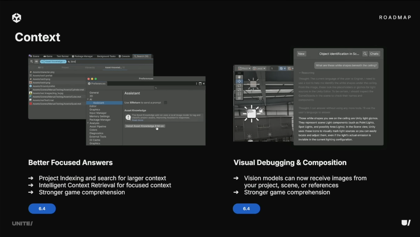 6.4ではより強力なゲームコンテキストを提供。エージェントがプロジェクトをインデックス化し、アセットを分類して検索可能なナレッジグラフを構築。コンテキスト共有もより賢くなり、複雑なプロジェクトでもプロンプトに必要な情報のみを含める。それによりエージェントが情報過多に陥らず適切な情報を得られる。スクリーンショット送信によるビジュアル入力にも対応し、エディタやシーンの画像を送信可能。これらの組み合わせにより、エージェントはプロジェクトに対してより深く、正確で、関連性の高いコンテキストを獲得。