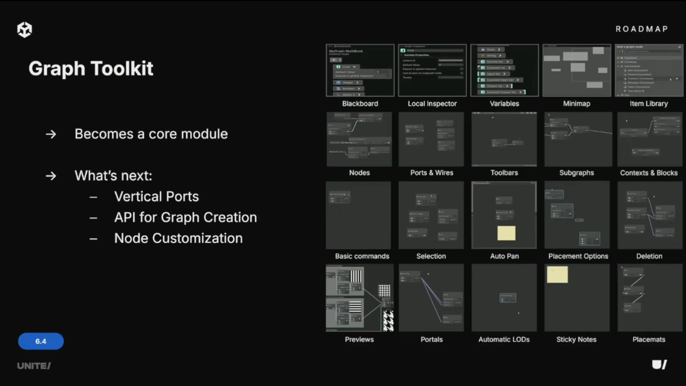 Graph Toolkitは6.4でコアモジュールに昇格し、ノードベース編集のデフォルトフレームワークに。今後は垂直ポート、コードによるグラフ作成API、追加のノードカスタマイズを予定。
