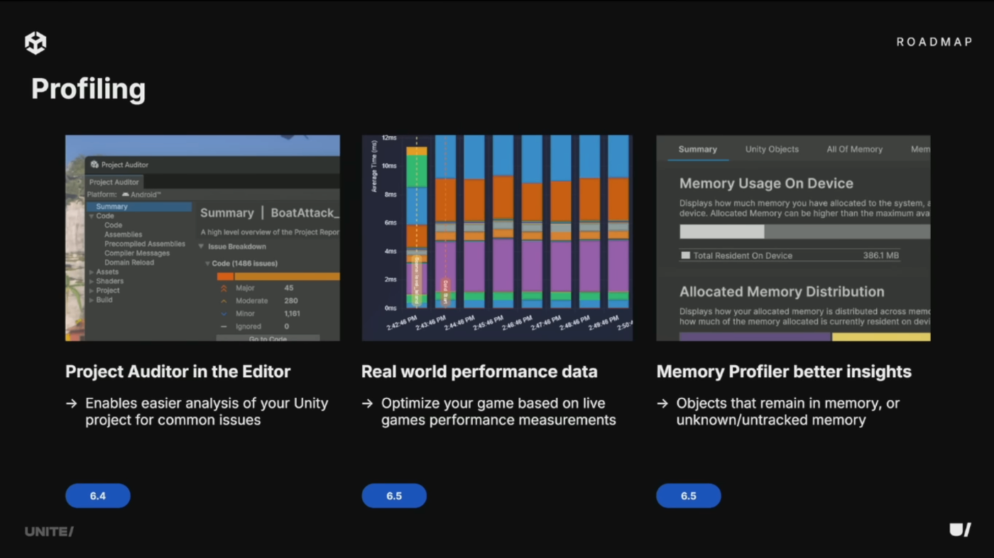 6.3では新しいProfiler Overviewを追加し、統計データビューによる最適化トラブルシューティングを簡素化。Project Auditorがコアパッケージに昇格。6.4ではDeveloper Data Framework経由の新データ収集ポイントを追加。6.5ではUnknown/Untrackedメモリの可視化を改善予定。
