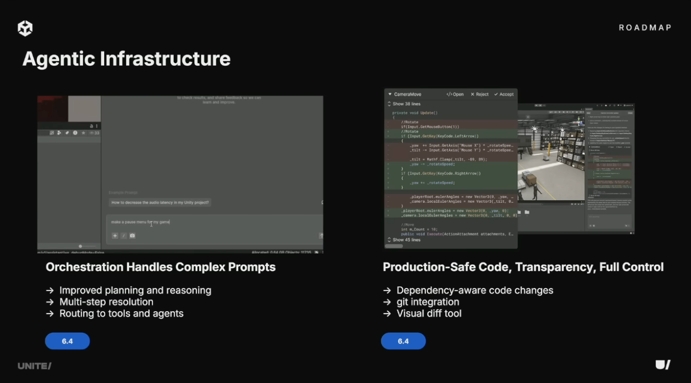 オーケストレーションを活用したエージェント基盤を構築。計画、複数ステップの実行、ツール使用、エージェント連携をサポート。Unity AIがプロジェクトの依存関係を理解するようになり、コード変更のリスクが低減。新しいDiffツールとGitサポートにより、変更をプロジェクトに取り込む前にすべての修正をレビュー可能。