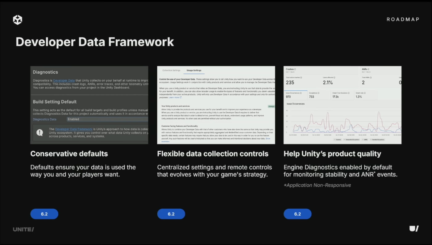 6.2で導入されたDeveloper Data Frameworkは、Unityの新しいデータ収集標準。Unityがデータ処理者(Data Processor)として機能することを明確にし、品質問題を早期発見するための重要なシグナルを送信する。プレイヤーの同意とデータコントロールはデフォルトで慎重に設定され、一箇所で管理可能。Engine Diagnosticsは新規プロジェクトでデフォルト有効となり、品質問題への迅速な対応が可能に。設定は必要に応じていつでも変更でき、リモートからゲームのデータ収集を制御して変化するニーズに対応できる。