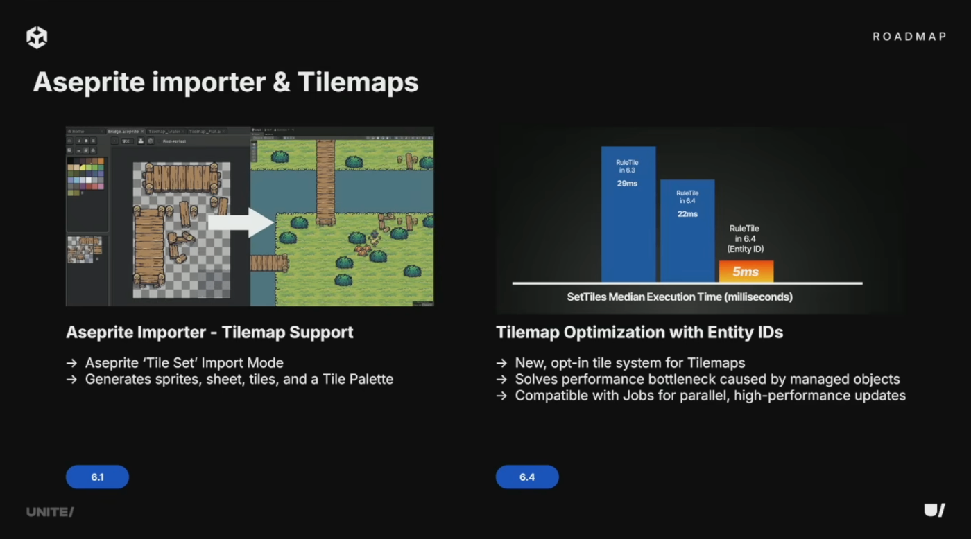 2Dボーンアニメーションは6.3でJob SystemとBurstコンパイラによるマルチスレッド化を実現。Unity 6.4では、詳細なキャラクターでしばしば主要なボトルネックとなる軸平行バウンディングボックス(AABB)計算の改善作業を完了予定。
