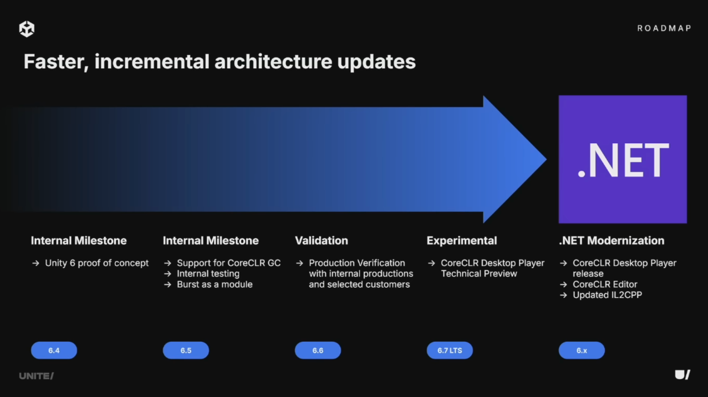 過去数年のロードマップで、将来に向けたUnityコアエンジンの基盤進化への投資についてUnityは説明してきた。CoreCLRへの移行など、この作業の一部はエンジンアーキテクチャの変更を伴う。