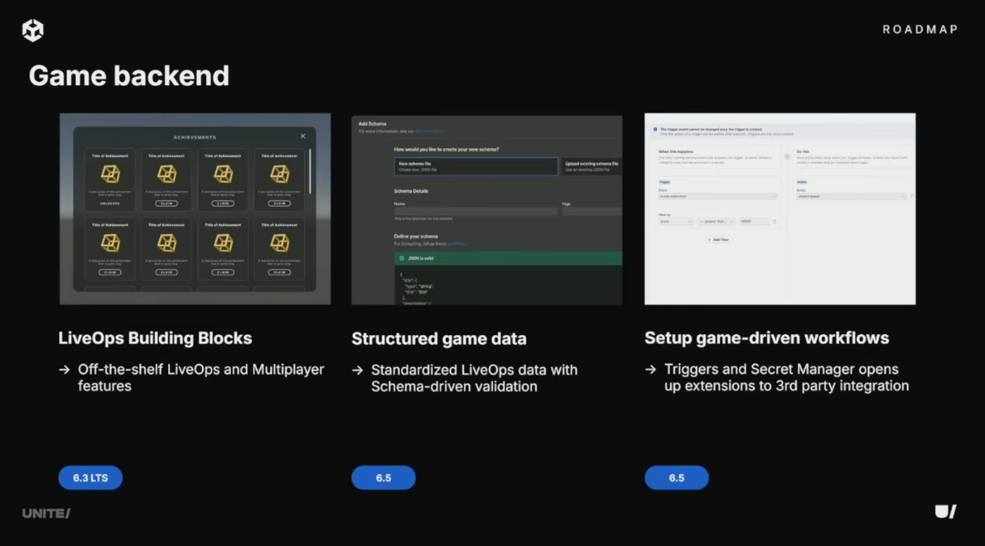 リーダーボード、実績、プレイヤーアカウント用のUnity Building Blocksを追加。標準化されたJSONスキーマによるデータ整合性の確保、Webhookによるサードパーティサービス連携、Secret Managerによる認証情報管理を導入。