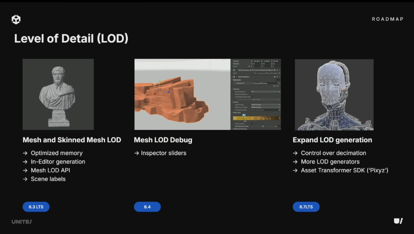 6.2ではメッシュとスキンメッシュの自動LOD生成・管理ワークフローを追加。フィードバックに基づき、LODの可視化と拡張性の制御を強化。将来的にはインポート時に新しいdecimation(メッシュ簡略化)アルゴリズムを統合し、出力の詳細な制御を提供予定。デフォルトの自動LODと必要に応じた完全な手動制御の両方を実現。
