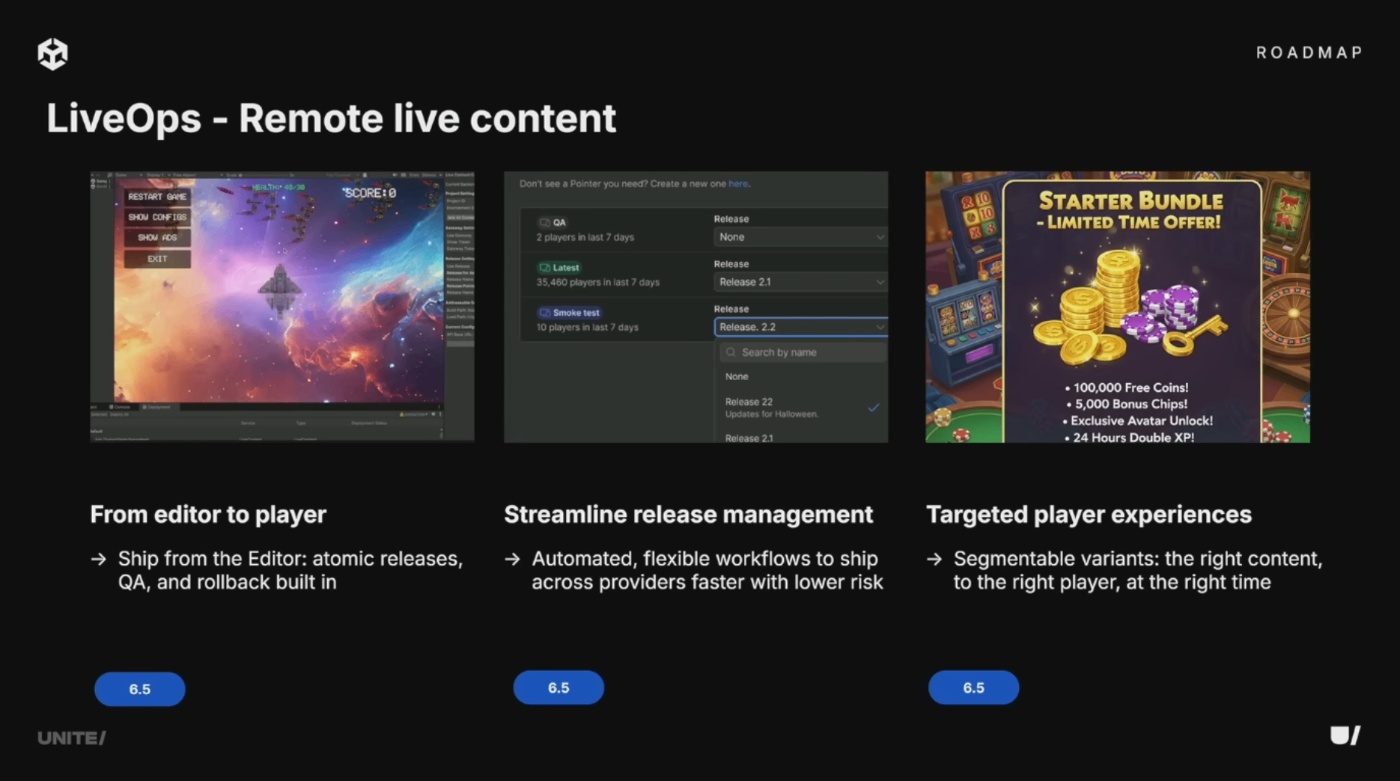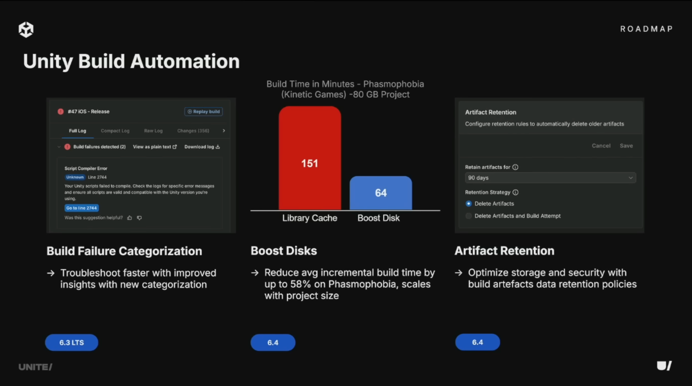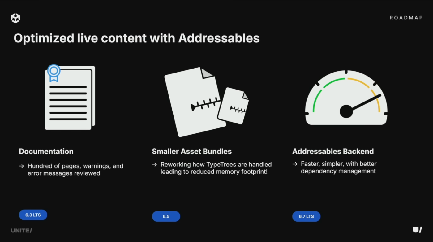 また、Addressablesに差し替え可能なバックエンドを開発中。コンテンツ配信の安全性向上、帯域幅コスト削減、デフォルトでの高パフォーマンスを実現し、ユーザーをより速く低コストでゲームに誘導できるようになる。