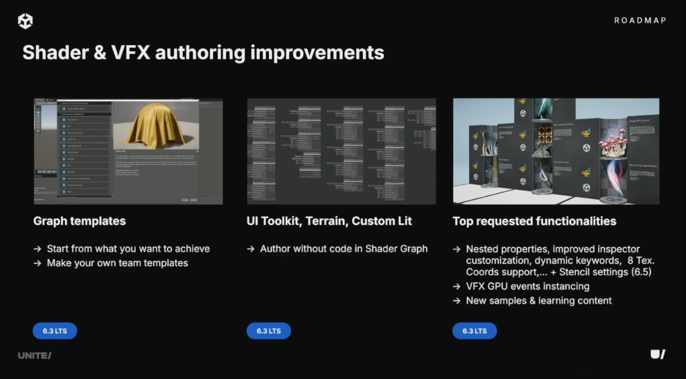 Shader Graphは6.3で最大のアップグレードを実施。カスタムUI、Terrain、スタイライズドシェーダーをコードなしで作成可能に。6.5ではステンシル設定のサポートを追加予定。VFX GraphはGPUイベントによるインスタンシングサポートといくつかのUX改善を実施。