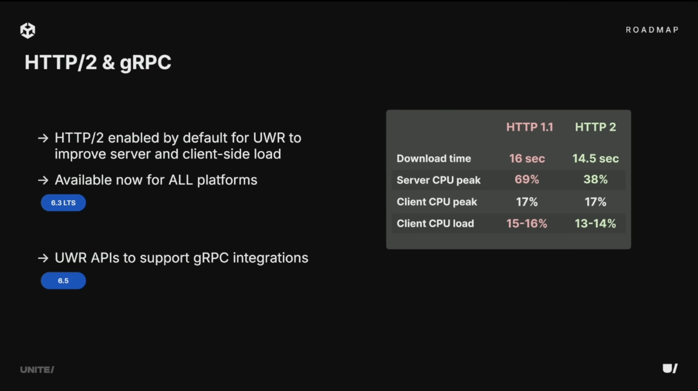 6.3ではUnity Web Requestがすべてのプラットフォームで、サーバーが対応していればHTTP/2接続をデフォルトで使用。Androidでの複数同時リクエストの初期テストでは、サーバー負荷を最大40%削減、デバイス上のCPU負荷を15〜20%削減という結果を確認。