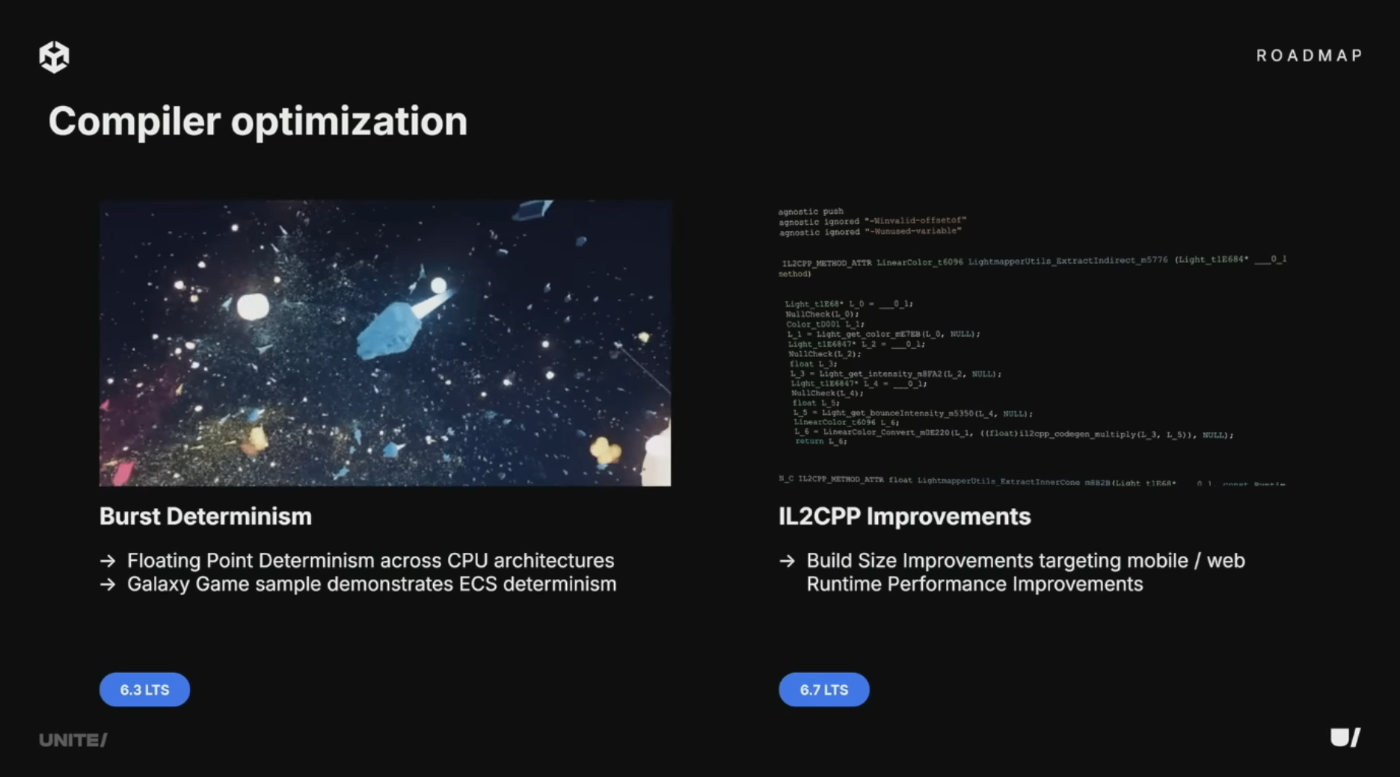 Unity 6.3に先行してリリースされたBurst 1.8.25で、異なるCPUアーキテクチャ(x86やARMなど)間でも浮動小数点演算の結果を一致させる決定論的動作をサポート。これはマルチプレイヤーゲーム開発者から最も要望の多かった機能の一つで、帯域幅の削減、ゲームプレイレイテンシの低減、クライアント改造によるチート防止に有効。