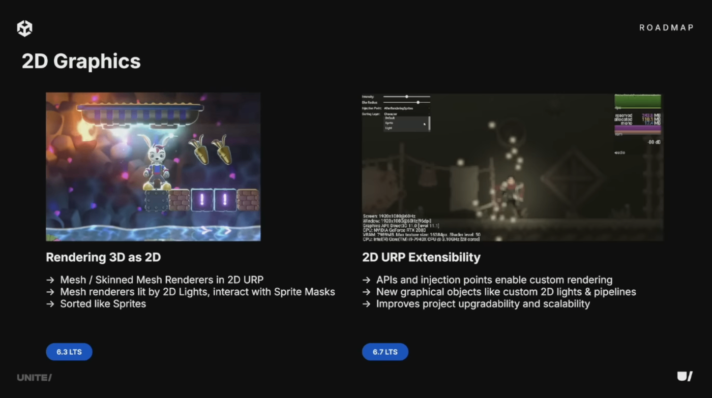 6.3では2D URPでMesh RendererとSkinned Mesh Rendererのレンダリングに対応し、2Dライティングとスプライトマスクとの連携が可能に。将来的には2D URP向けAPIと専用インジェクションポイントを提供予定。