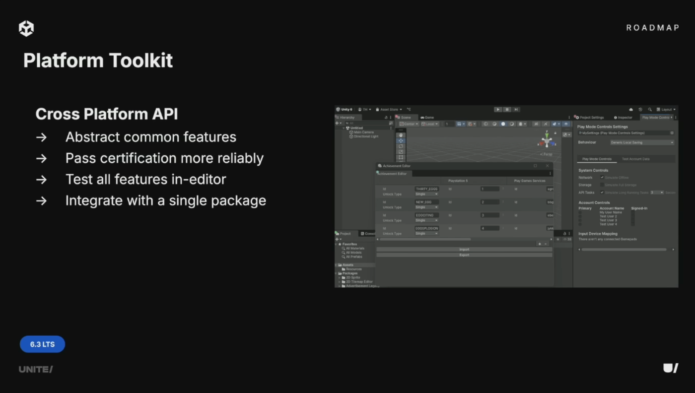 Platform Toolkitを使えば、すべてのユーザーおよびプラットフォームワークフローをエディタ内で直接ビルド・テスト可能。devkitやデバイスがなくても実績のアンロック設定とテストができる。ユーザー変更やセーブ中のストレージ問題といったエッジケースを含め、ユーザー処理用のすべてのUIを単一のビルドなしで構築・検証可能。新しいプラットフォームへのリリース準備ができたら、プラットフォームサポートパッケージをインストールするだけで完了。
