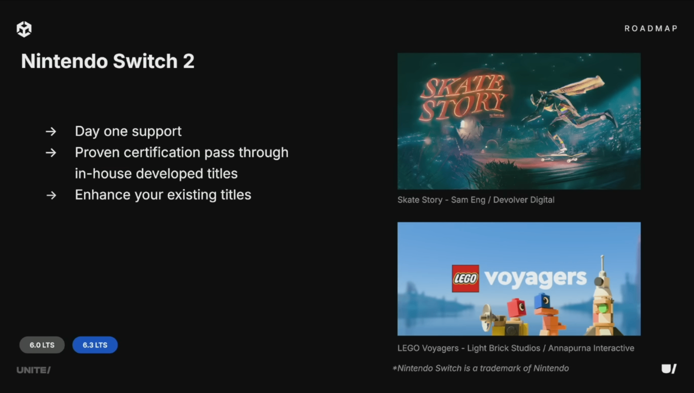 2025年6月5日は、世界中のコンソールファンにとって大きな日となった。Nintendo Switch 2の発売に合わせ、UnityはDay Oneサポートを提供。Skate StoryやLego Voyagersなどの素晴らしいゲームを実現した。Unityは事前にNintendoと協力し、情報開示を受けた開発者が最初から確実なサポートを得られるようにした。