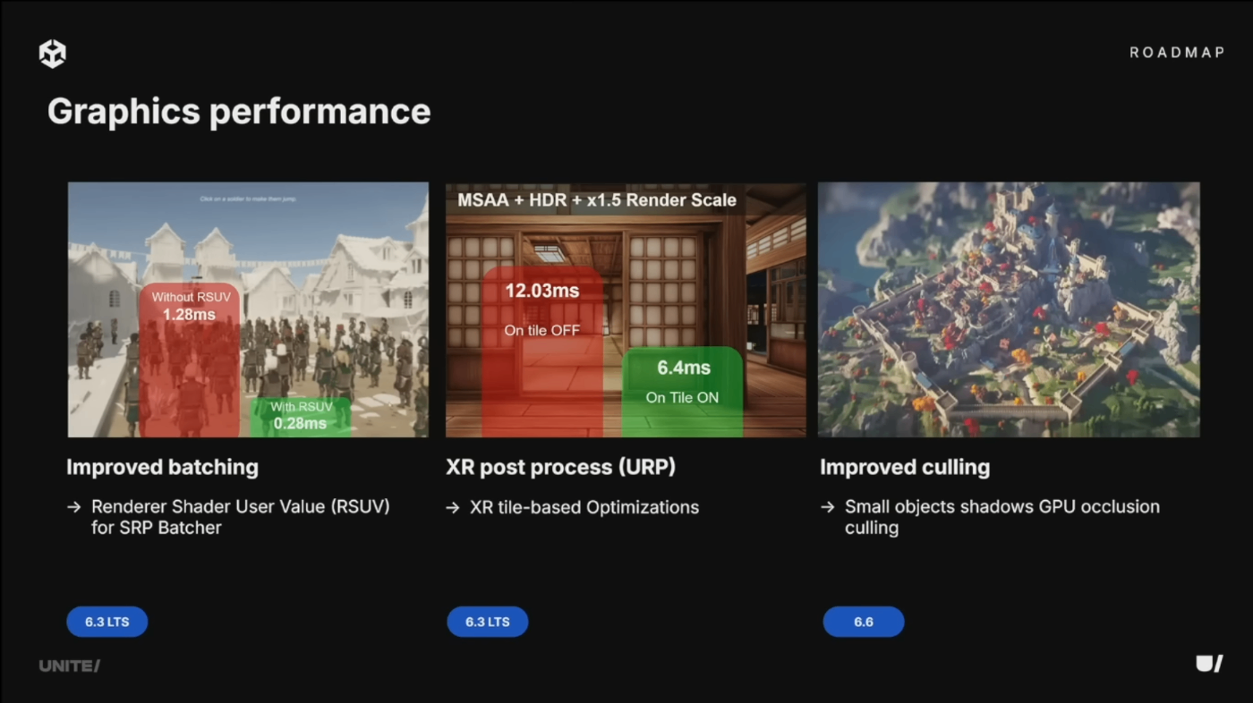 6.3ではランタイムバリアント付きバッチレンダリングを導入。Render Shader User Value(RSUV)をシェーダーで設定・取得可能になり、群衆レンダリング時に個体ごとのバリエーションを維持しながら効率的に描画できる。Metaとの協力によりXR向けオンタイルポストプロセッシングも追加され、トーンマッピング、カラーグレーディング、グレイン、ビネットなどのエフェクトをVR内で実行可能に。今後はGPU Resident Drawerのシャドウ処理とGPUカリングの最適化を予定。