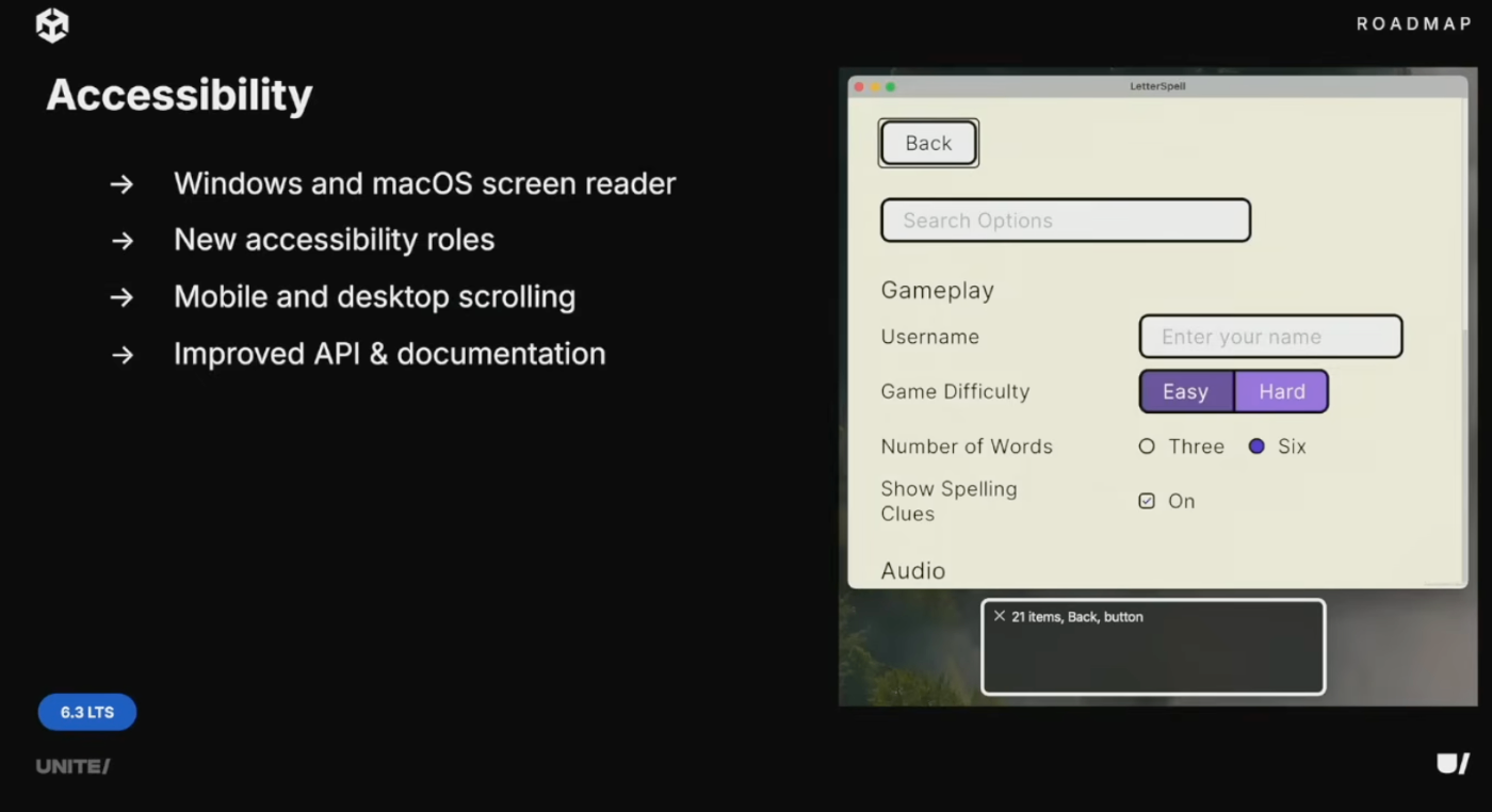 アクセシビリティ面では、6.3でモバイル向けスクリーンリーダーサポートをWindows・macOSなどのデスクトップに拡張。インターフェース構造の解釈機能やスクリーンリーダースクロールによるスムーズなナビゲーションも追加し、Unityアプリケーションのアクセシビリティがデフォルトで向上。