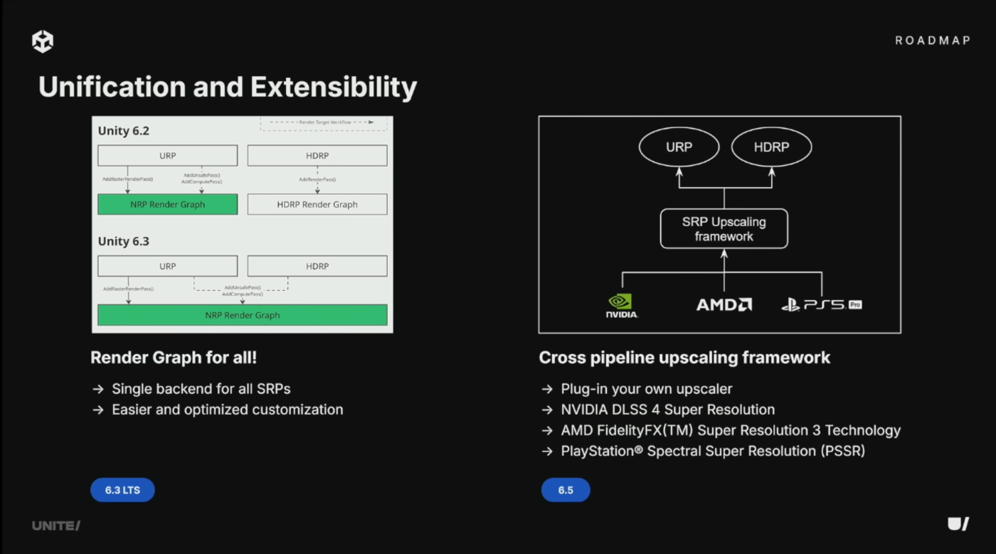 6.3からRender GraphがすべてのSRPの共通バックエンドに。Cross-Pipeline Upscaling Frameworkを導入し、FSR、XeSS、DLSSなどのサードパーティアップスケーラーを両グラフィックスパイプラインで使用可能に。