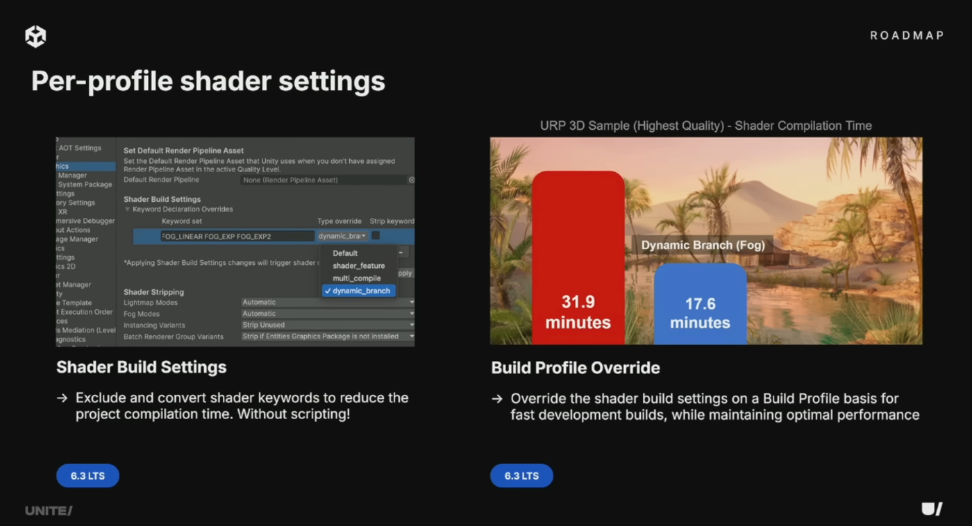 6.3の新しいShader Build Settingsでシェーダーを最適化し、ビルド時間を短縮可能に。ビルドプロファイルごとにオーバーライドでき、ビルド時間とランタイムパフォーマンスのバランスを調整できる。元のシェーダーソースを変更せずにシェーダーキーワードの変換や除去が可能で、例えばFogキーワードをDynamic Branchに変換するとURPのビルド時間を最大45%短縮できる。今後はシェーダーコンパイラの詳細設定や、シェーダー読み込み時のメモリ使用量上限を指定するオプションも追加予定。各ビルドプロファイル向けの推奨設定も提供し、すべてのプラットフォームでビルド時間を短縮。