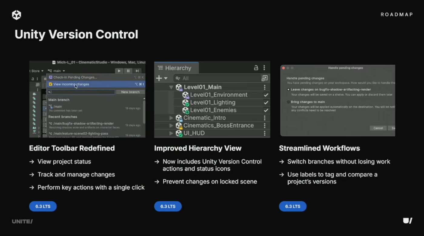 エディタ内体験を大幅に改善。エディタツールバーを再設計し、プロジェクトステータスの確認と主要アクションの実行を迅速化。Hierarchyビューにもバージョン管理用のクリッカブルアクションとステータスアイコンを追加し、ロックされたシーンを即座に識別可能に。ワークフロー全体も改善され、シームレスなブランチ切り替えとバージョン比較が可能に。