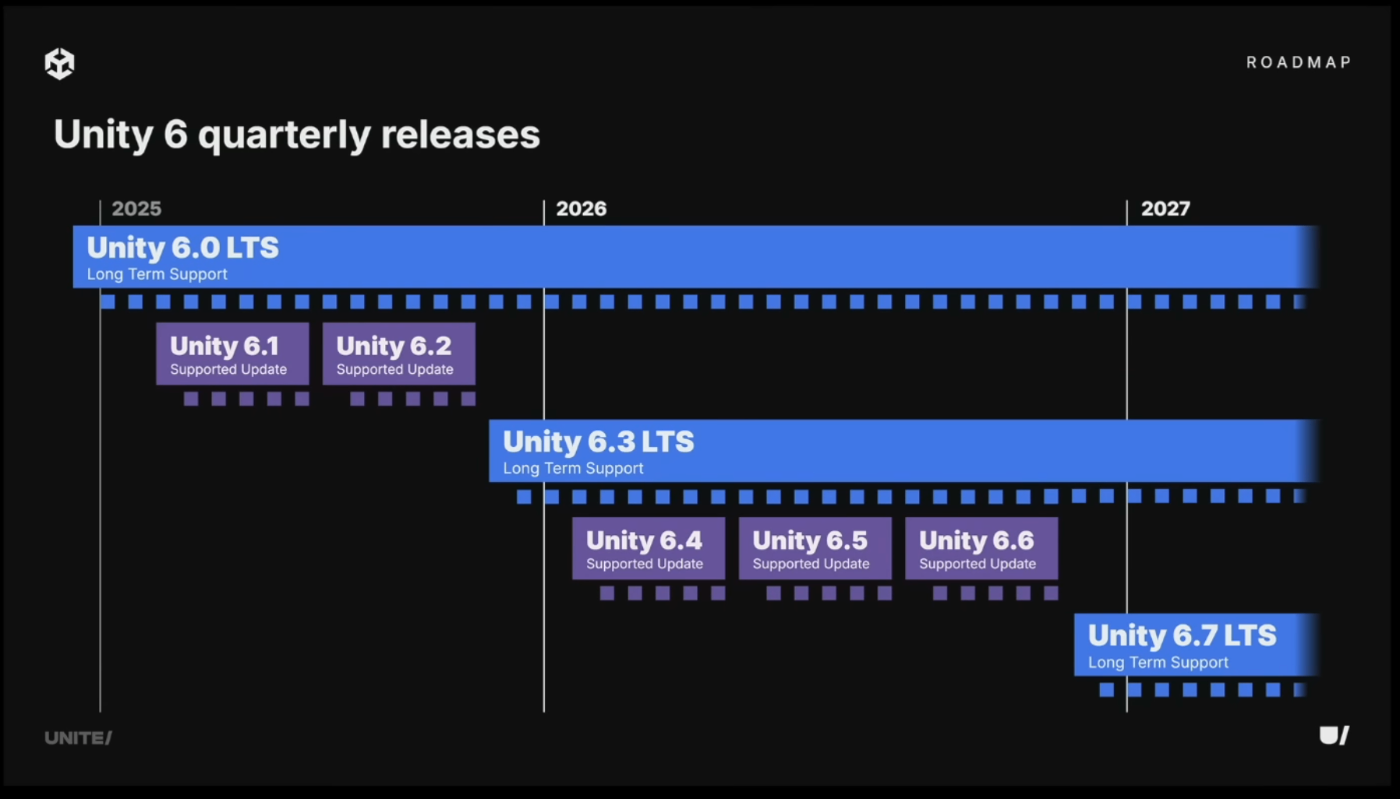 Unity 6.0 LTSは昨年10月にリリースされ、すでに約600万ダウンロードを達成。6.1ではDeferred+レンダリングパス、6.2ではGraph Toolkitを追加。6.3は数週間以内にLTSとしてリリース予定。2026年は四半期ごとにサポート付きアップデートを提供し、6.7が次のLTSとなる予定。