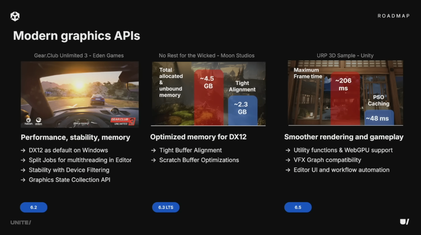 DX12がWindowsのデフォルトグラフィックスAPIになりました。Eden Gamesの「Gear Club Unlimited 3」など、実際にDX12で出荷されたスタジオからのフィードバックを基に、パフォーマンス、安定性、メモリ使用量を大幅に改善。6.2と6.3でレンダリングスタッターの解消、パイプライン事前コンパイルAPI、Typed Buffer Alignmentによるメモリ最適化、旧ハードウェア向けデバイスフィルタリングを追加。