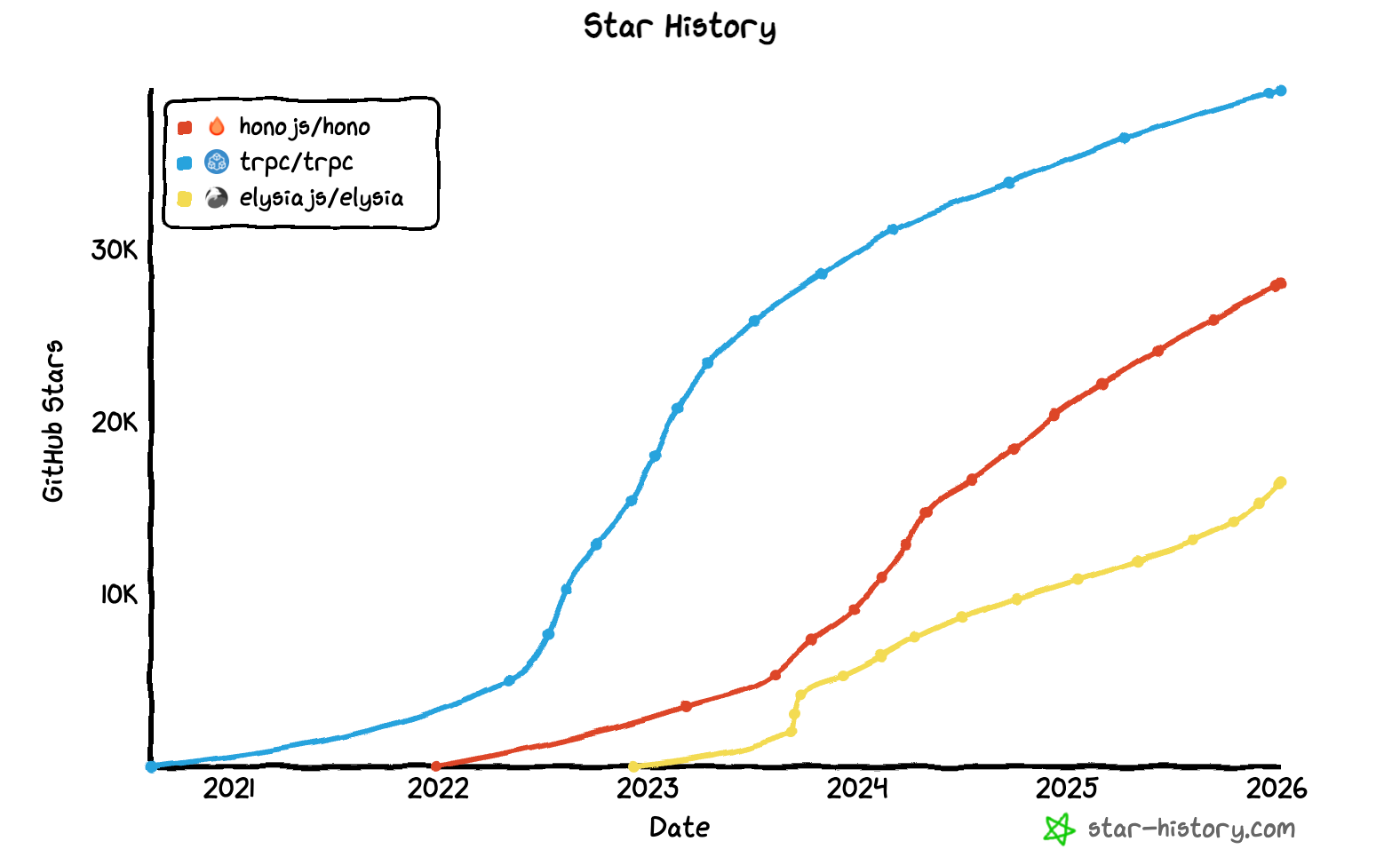 tRPC, Hono, and Elysia are all on an upward trend, and given their good compatibility with frontends like Next.js, they are likely to continue gaining popularity.