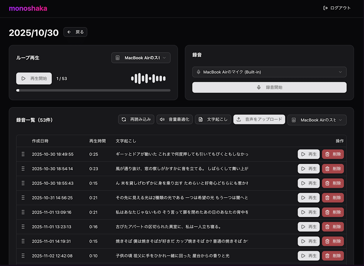録音・再生・管理機能は 1 つのページに統合されており、録音を追加しながら再生を続けることができるように実装しました。