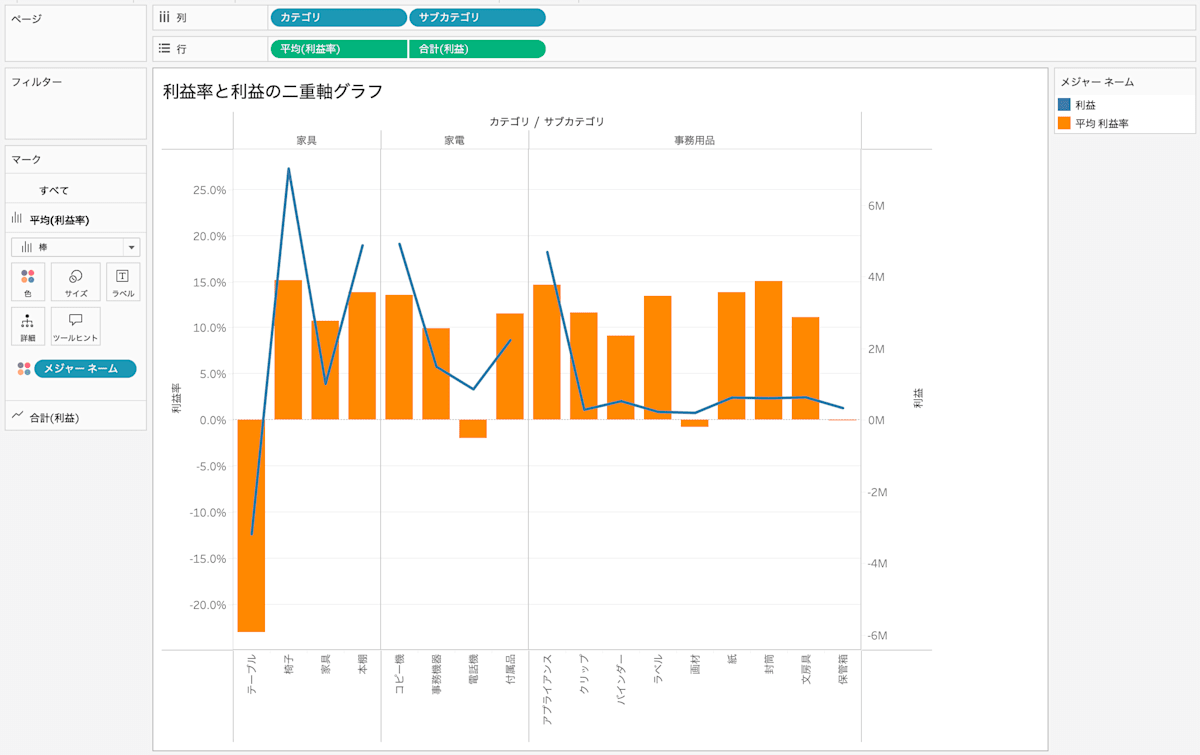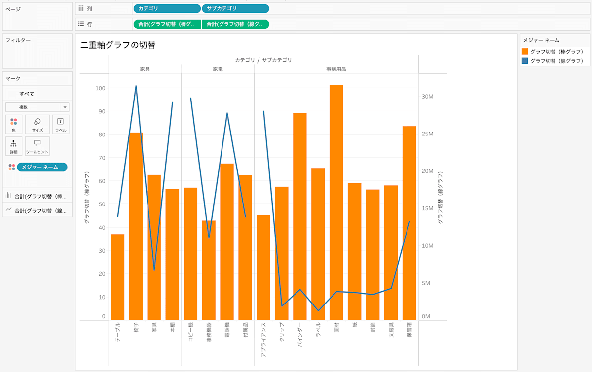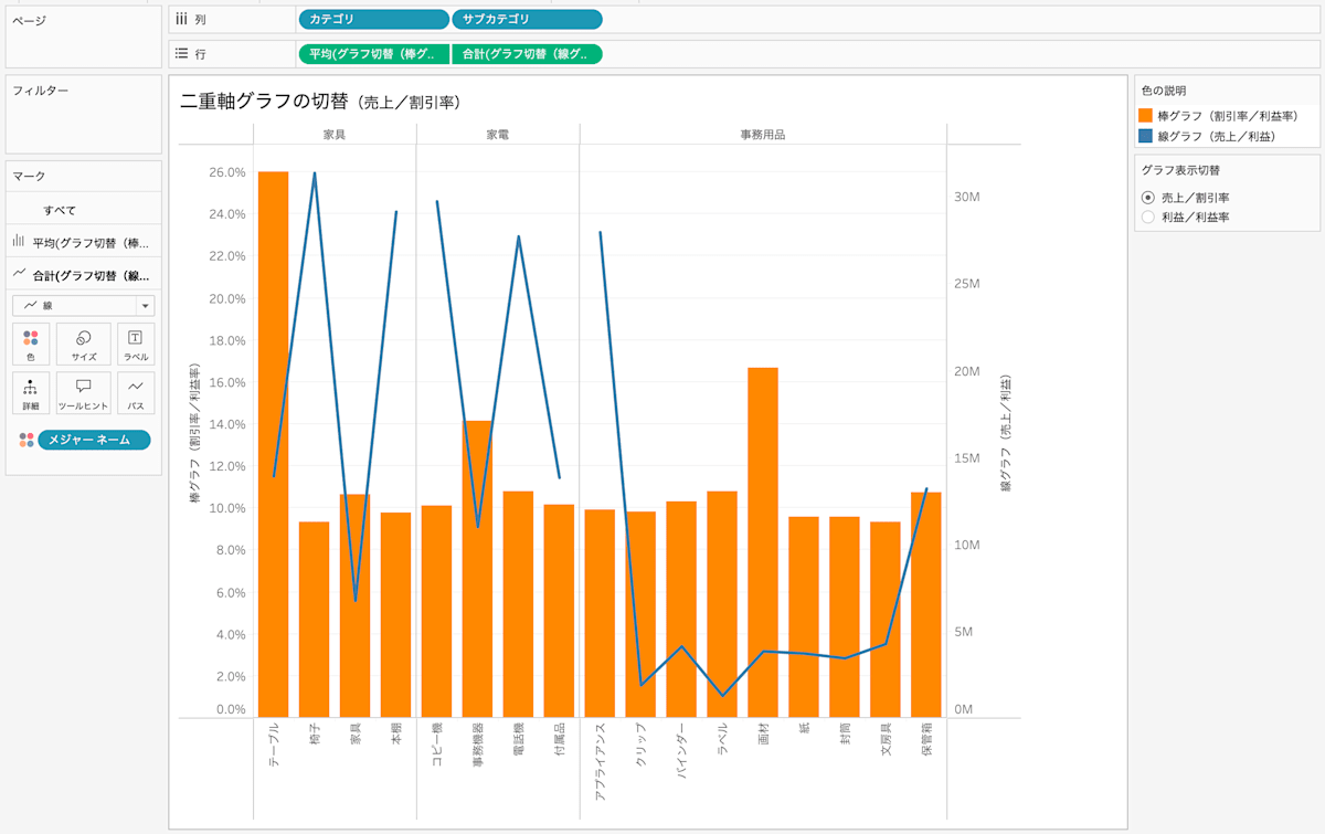 項番3. で作成した計算フィールドを使って二重軸グラフを作成します。