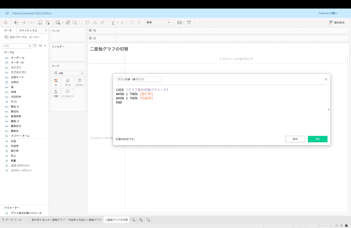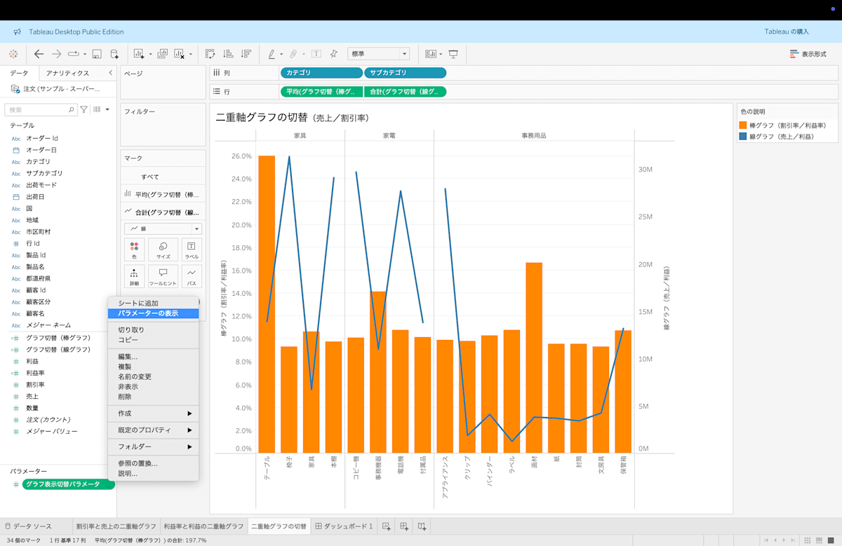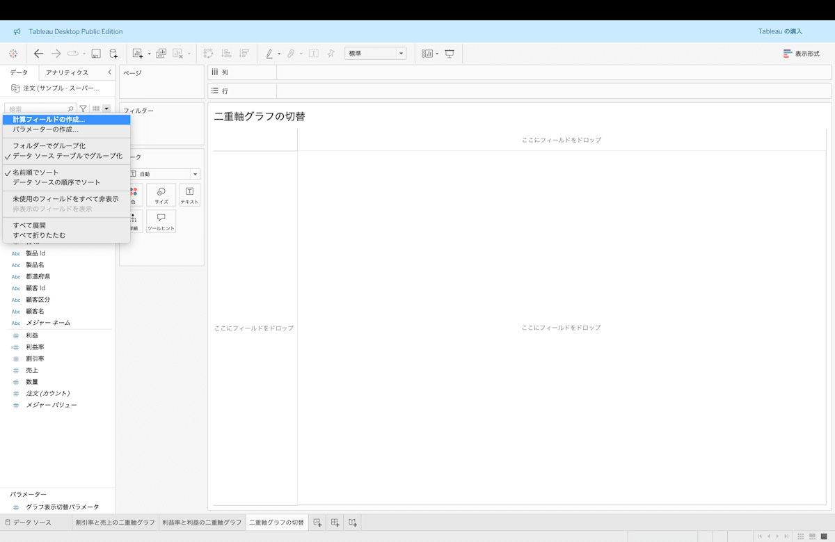 以下、2つの二重軸グラフをパラメータと計算フィールドによって表示切替をする手順をまとめました。